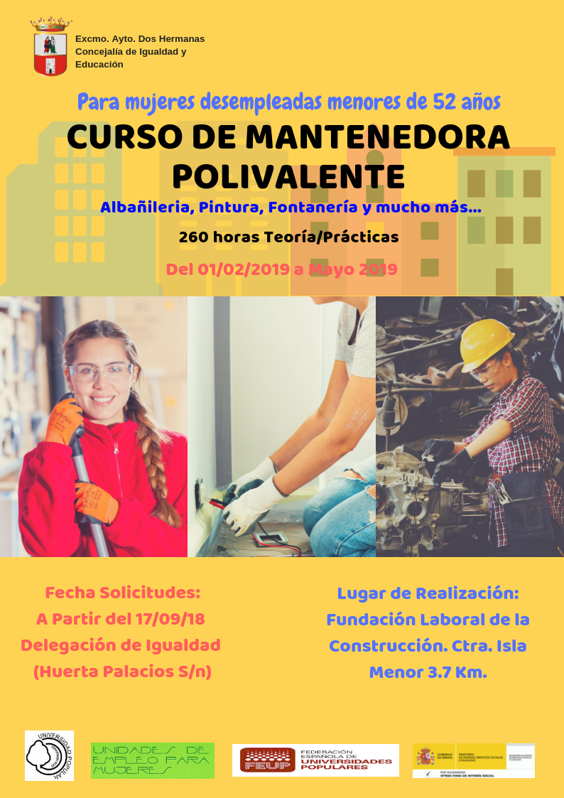 Curso albañilería, pintura, fontanería y carpintería para adquirir los conocimientos básicos asociados a las tareas propias para el mantenimiento de edificaciones y equipamientos urbanos, respondiendo a las exigencias del mercado laboral. Requisitos de acceso: nivel académico mínimo Certificado de escolaridad o equivalente, EGB, ESO, FP. Se valorará experiencia en el sector. Se emite diploma acreditativo.
